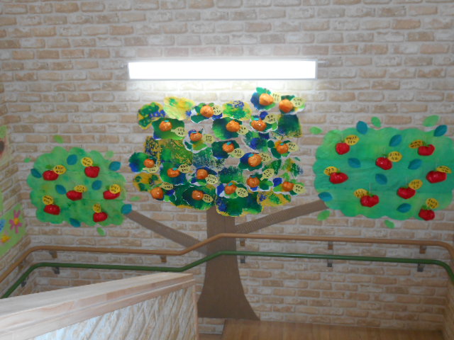 入口です。 みんなの作品です。 いちご・みかんの木です。 いちご組の旗です。